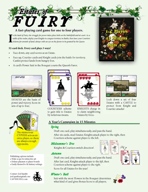 Thoroughly developed and tested, this 52-card deck can be supplemented with a playing mat or player boards for added appeal. Ready for publishing!