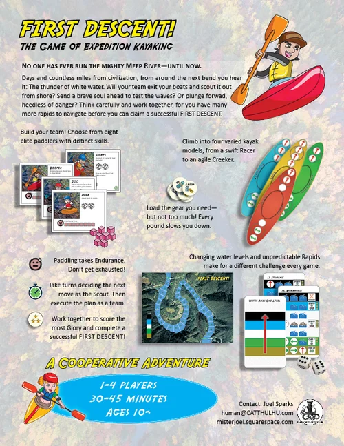 Days and countless miles from civilization, on a river no one has ever paddled before. From around the next bend you hear it: The thunder of white water, echoing through the trees. Will you exit your kayaks and scout it out from shore? Send a brave soul forward to test the waves? Or plunge ahead, heedless of danger? Think carefully and decide as a team, for you have many more rapids to navigate with limited time and resources before you can successfully claim a completed FIRST DESCENT.