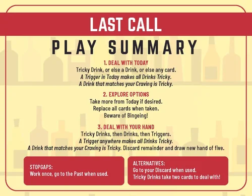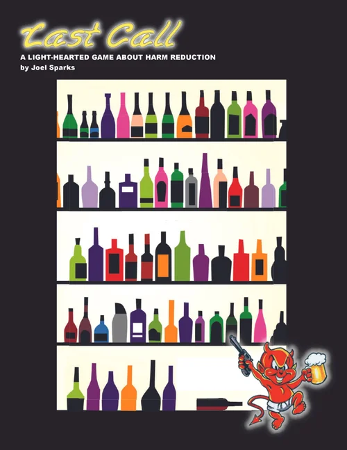Last Call: The Undrinking Game is a cooperative experience in thinking about alcohol. Not a 12-step activity, but a deck of realistic options and challenges based on Mr. Joel's own recovery experience. Players build a Life Deck of strategies and habits to get rid of Drink cards, which keep coming around. A player who gets Clean can lend help to others if asked. If everyone is Clean before the cards run out, everyone wins! An educational yet amusing game for anyone who wonders about cutting back on the booze.